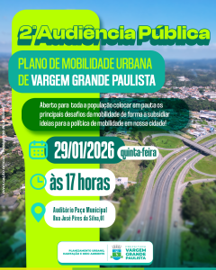 A Prefeitura de Vargem Grande Paulista promove, no dia 29 de janeiro de 2026 (quinta-feira), a 2ª Audiência Pública do Plano de Mobilidade Urbana, com o objetivo de ampliar o diálogo com a população e discutir os principais desafios e propostas para a mobilidade no município.