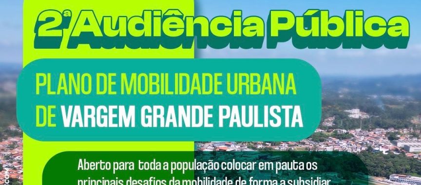 A Prefeitura de Vargem Grande Paulista promove, no dia 29 de janeiro de 2026 (quinta-feira), a 2ª Audiência Pública do Plano de Mobilidade Urbana, com o objetivo de ampliar o diálogo com a população e discutir os principais desafios e propostas para a mobilidade no município.